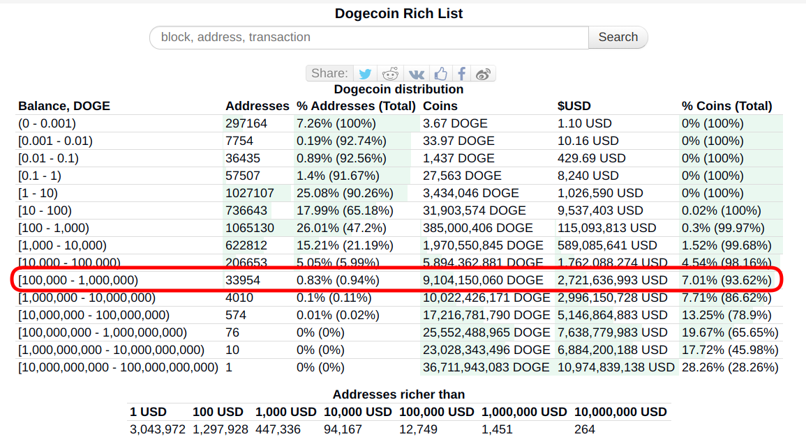 Presta atención a la siguiente imagen. Allí se ve la distribución de DOGE en todas las billeteras conocidas que lo almacenan: