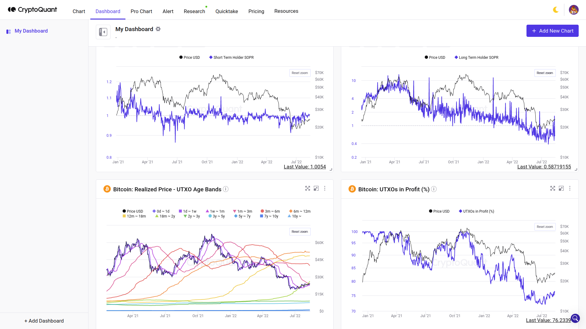 1) Arriba a la izquierda: puedes ver el ratio de los short term holders (traders) que cambiaron su BTC en profit o a pérdida. Valores por encima del 1 indican profit, valores por debajo, pérdidas.