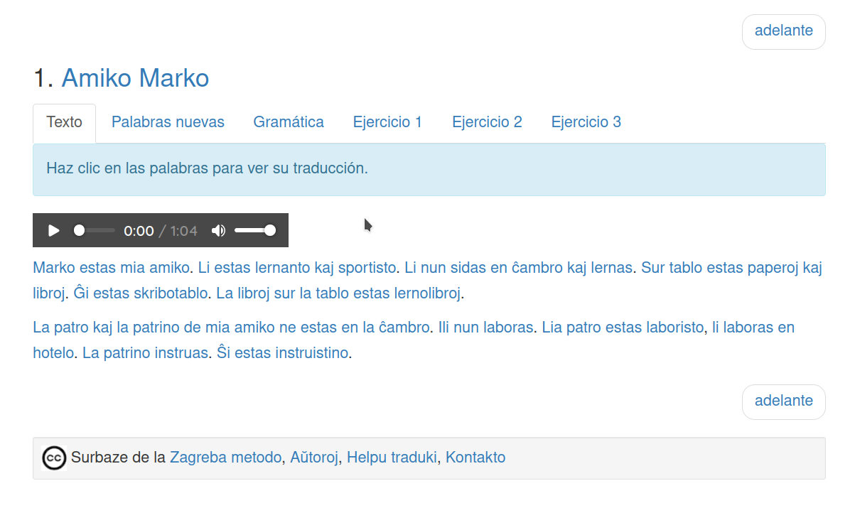 El curso tiene 12 lecciones, cada una con un texto, una explicación gramatical y 3 ejercicios