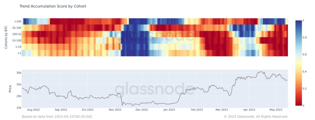 De este modo, las grandes ballenas de bitcoin se aproximan a la tendencia de no acumular o vender de los inversionistas más pequeños . Esto puede verse representado en rojo al final del gráfico, lo que ha estado ocurriendo desde mediados de abril.