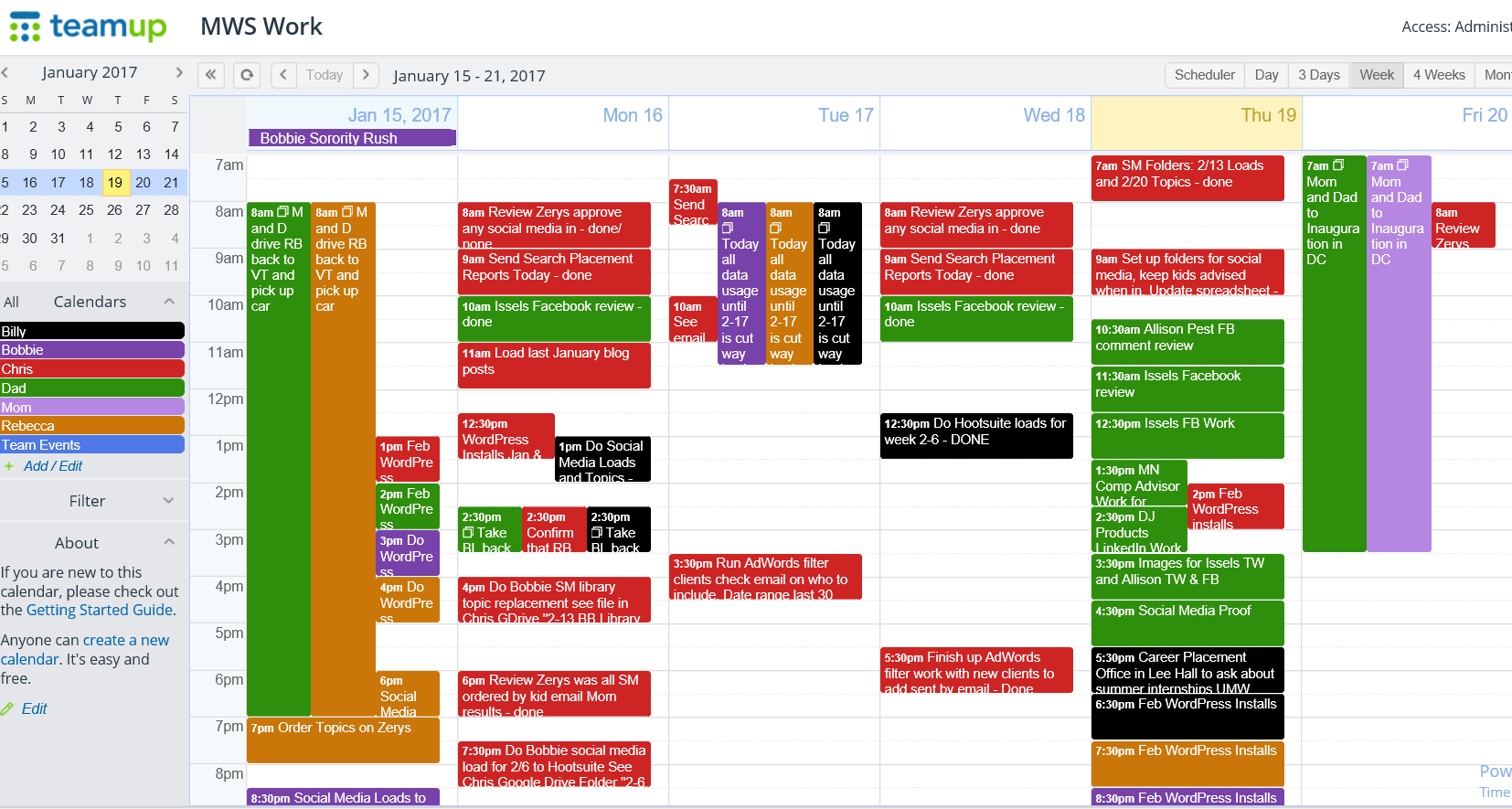 Pros: Calendario orientado a la organización de equipos de trabajo. Compartir información y darle seguimiento, se puede personalizar con permisos de acceso. Posibilidad de compartir links para acceder sin cuenta de usuario. Integración con otros calendarios. Manejo de eventos con personas en distintas zonas horarias. Permite adjuntar imágenes.