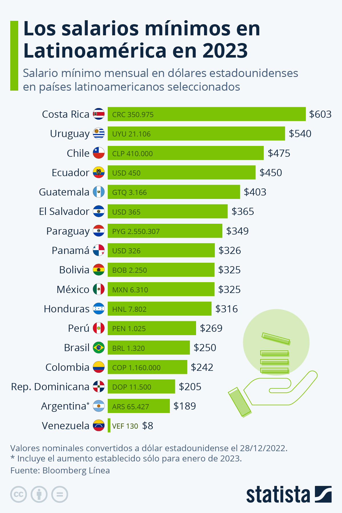 El salario mínimo en Argentina hoy es de 150 dólares (tipo de cambio real a 535 con cepo cambiario).