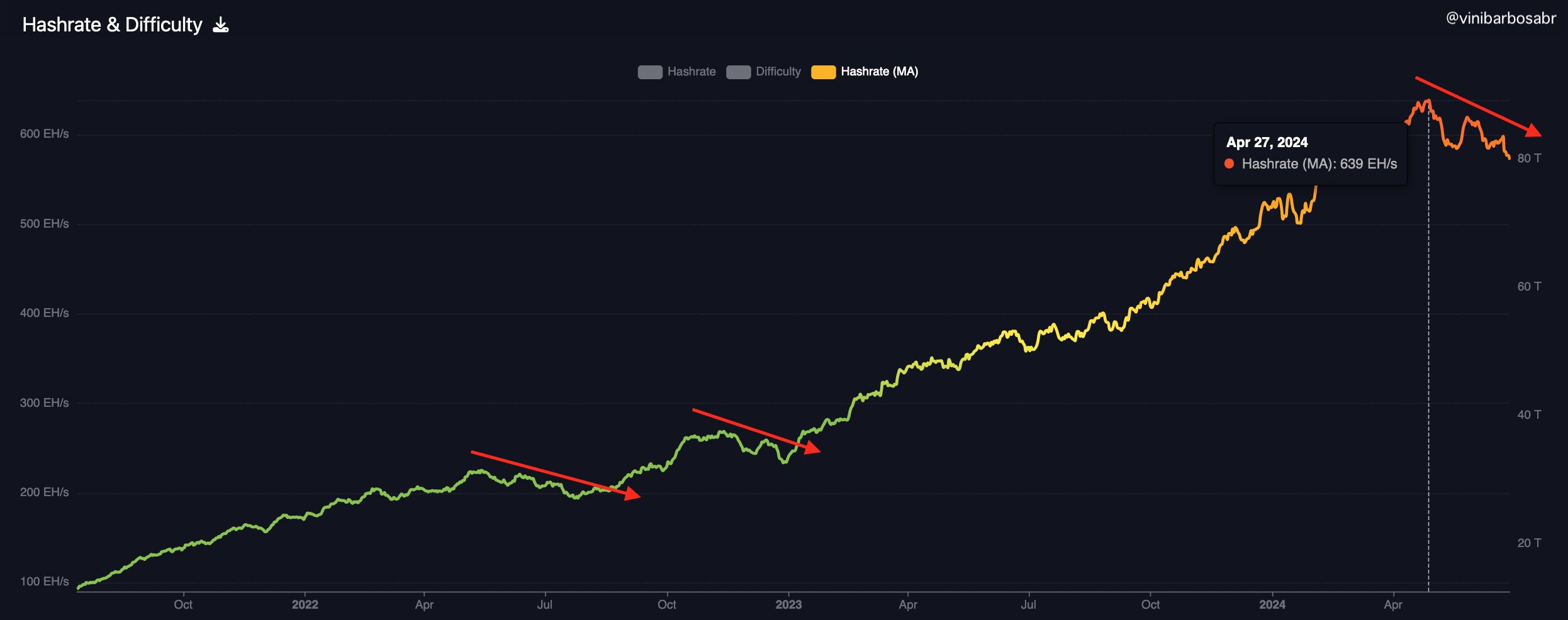 En concreto, los datos de mempoolspace muestran una secuencia de dos máximos más bajos tras el pico del 27 de abril de 639 EH/s.