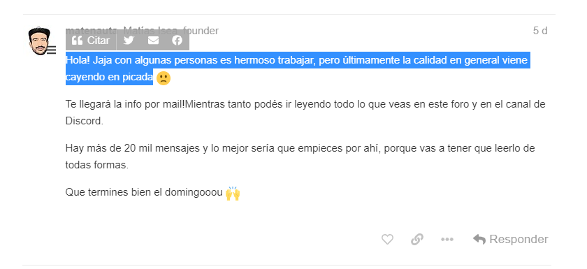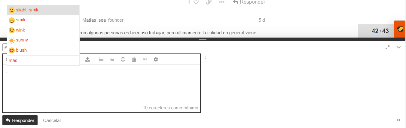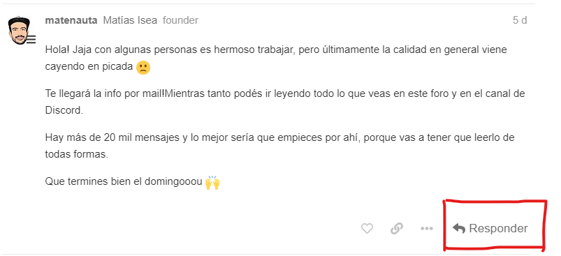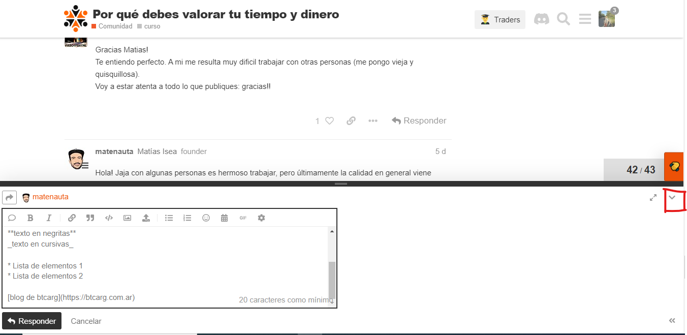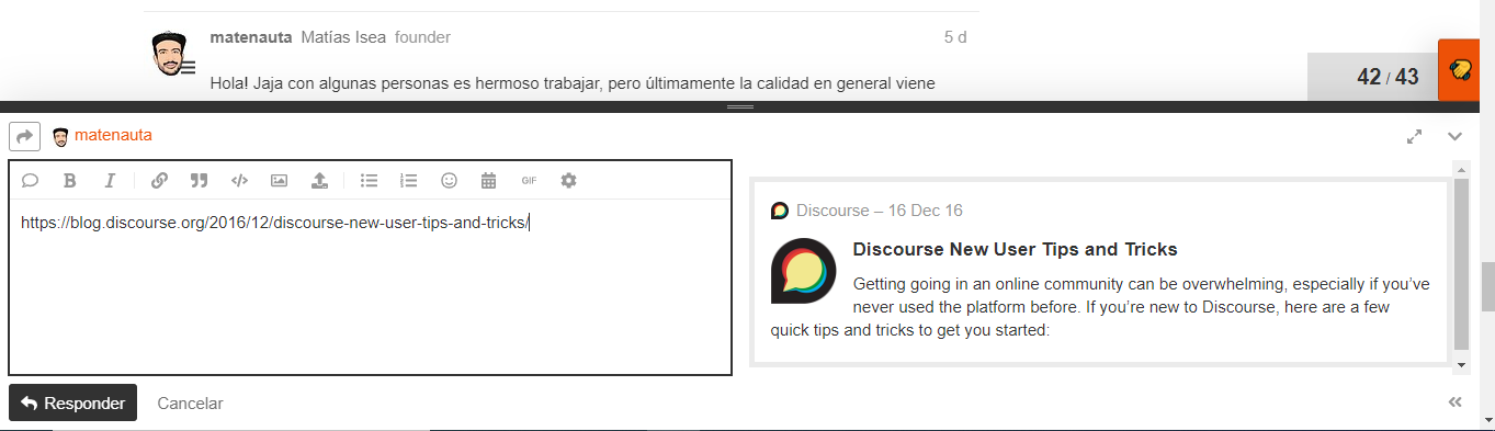 Presione cualquier botón Responder para abrir el panel del editor en la parte inferior de su navegador. Continúe leyendo (e incluso navegue a diferentes temas) mientras redacta su respuesta; minimizar el editor en la parte superior derecha del panel de respuesta para más espacio. Los borradores se guardarán automáticamente a medida que escribe.