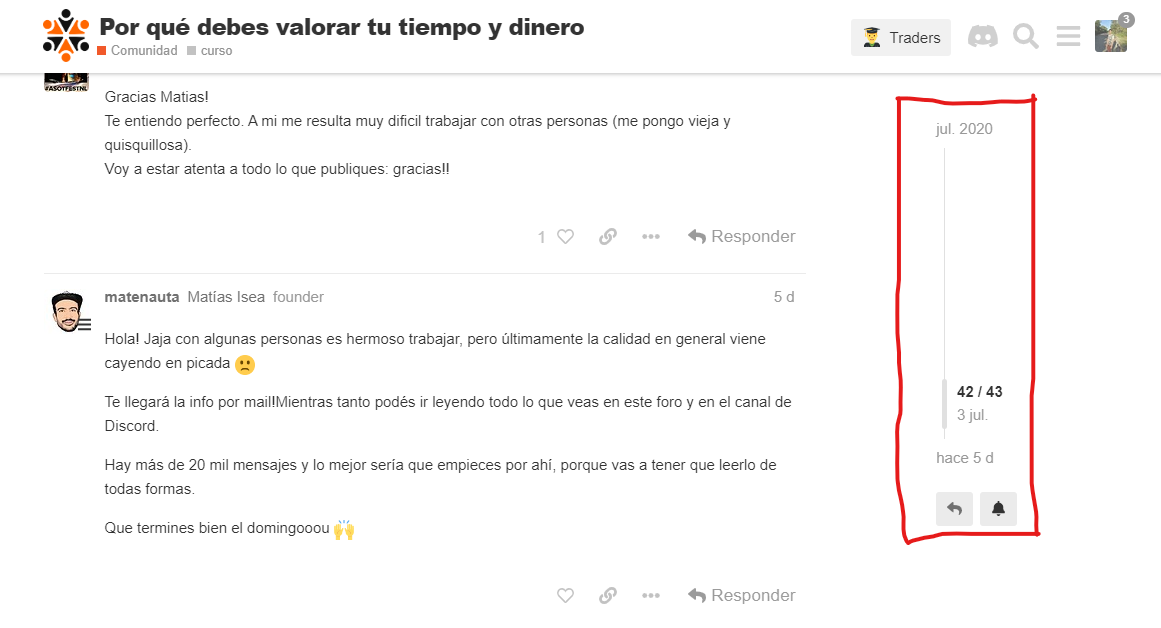 Mientras lee un tema, use la línea de tiempo en el lado derecho para saltar a la parte superior, inferior o a su última posición de lectura. En pantallas más pequeñas, seleccione la barra de progreso inferior para expandirla: