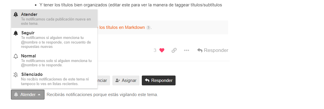 Puede cambiar su nivel de notificación para cualquier tema a través del control de notificación en la parte inferior y en el lado derecho de cada tema. (El nivel de notificación también se puede configurar por categoría, busque el control de notificación en la parte superior derecha de cada página de categoría).