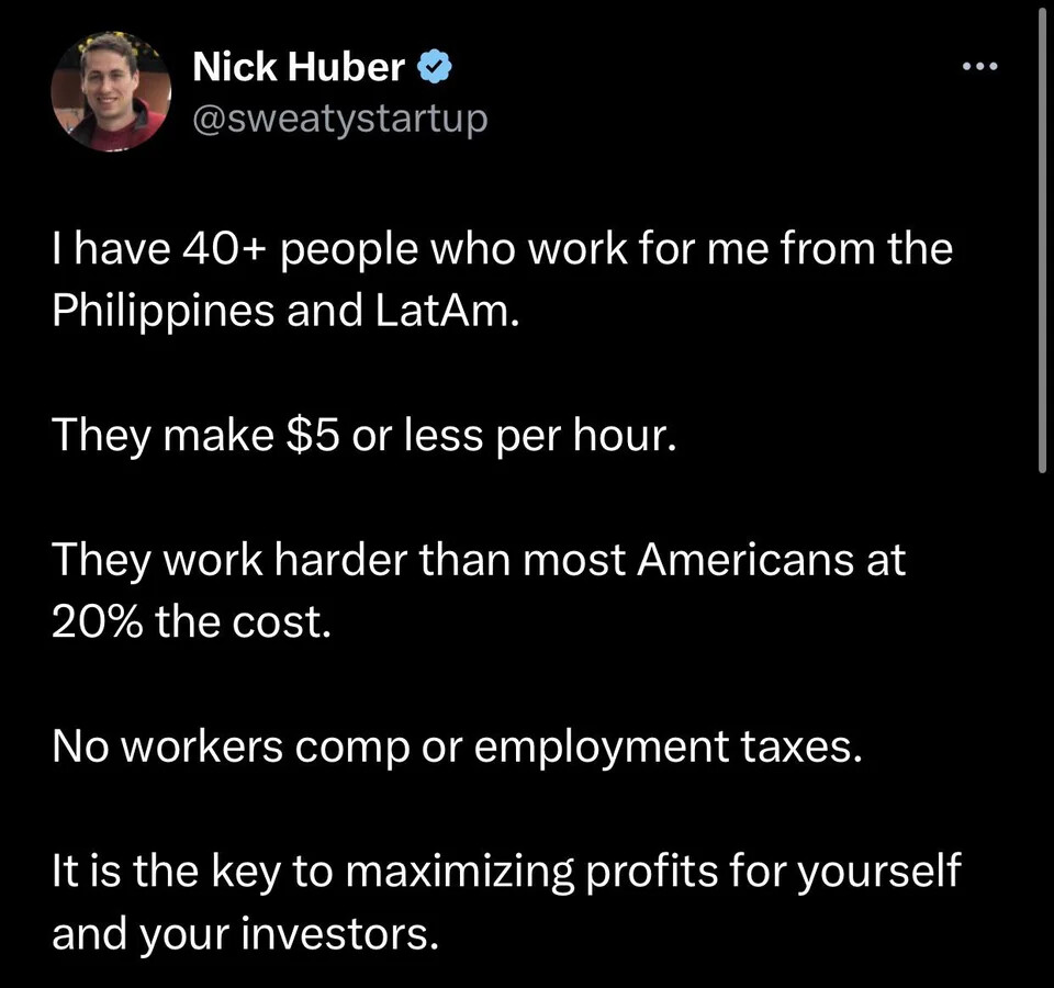 CEO de startup mencionando que paga menos de 5 dólares la hora en América Latina y Filipinas (la AI reduce ese monto 10 veces).