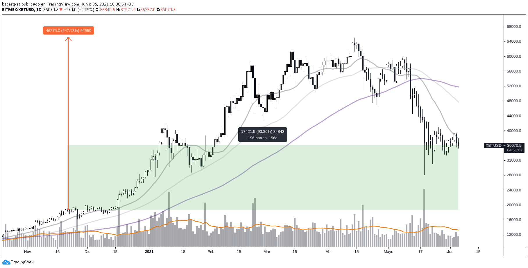 Desde el concurso anterior en noviembre del año pasado, BTC registra a la fecha un 93% de beneficios frente al USD, luego de un pico en 247%: