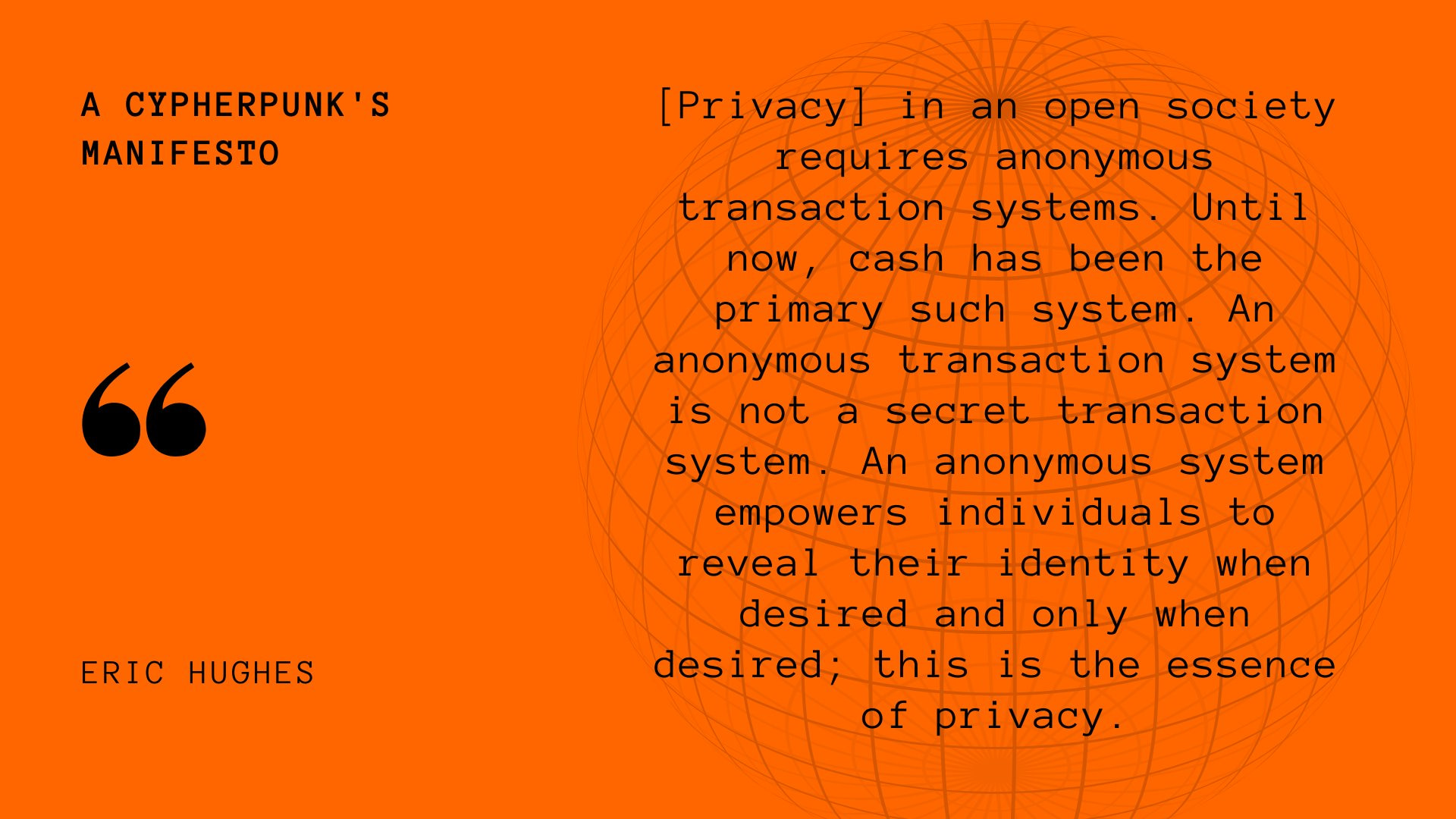 Debemos defender nuestra propia privacidad si esperamos tener alguna. Debemos unirnos y crear sistemas que permitan que se realicen transacciones anónimas.