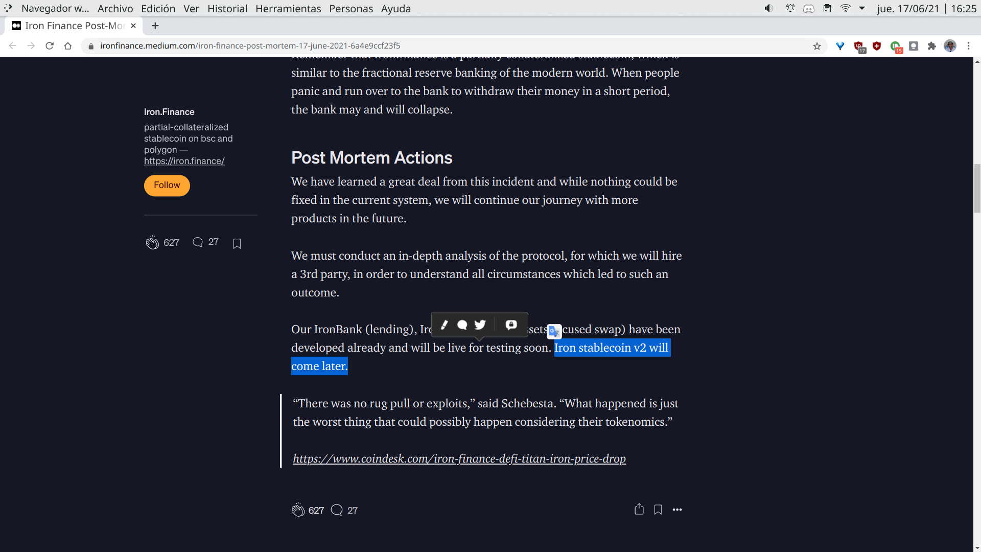 Iron Finance fue (¿es?) un ecosistema de monedas estables (¿estables?) parcialamente colaterizado de múltiples cadenas.