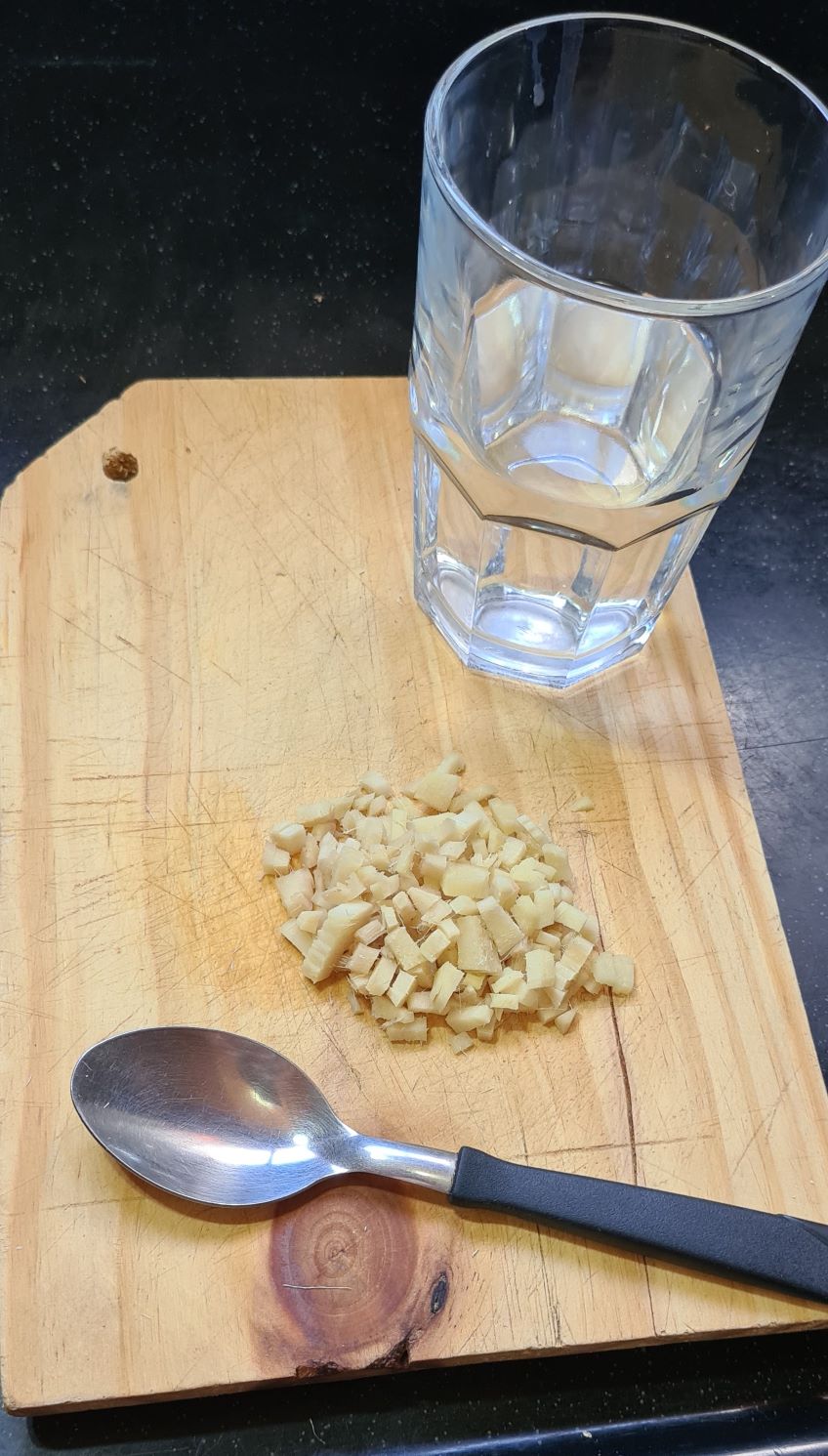 3. Pelamos un trozo de jengibre y lo picamos lo más pequeñito que podamos, la cantidad debe ser lo que entre en la palma de la mano.