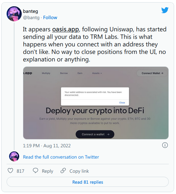 Al momento de esta publicación, no está claro qué herramientas está utilizando Oasis para identificar billeteras consideradas “de alto riesgo”. Al igual que Oasis, el intercambio descentralizado (DEX) Uniswap recientemente comenzó a bloquear billeteras supuestamente asociadas con actividades ilícitas mediante el uso de datos de TRM Labs. TRM Labs ayuda a las entidades a detectar e investigar delitos financieros relacionados con las criptomonedas mediante análisis en cadena. Hasta ahora, los comentarios sobre la nueva medida de Oasis han sido en su mayoría negativos.