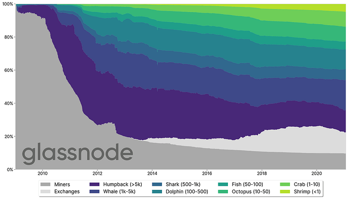 El redactor de Glassnode deduce que “alrededor del 2% de las entidades de red controlan el 71,5% de todo Bitcoin”, un número diferente y menos amarillista que el de Bloomberg.