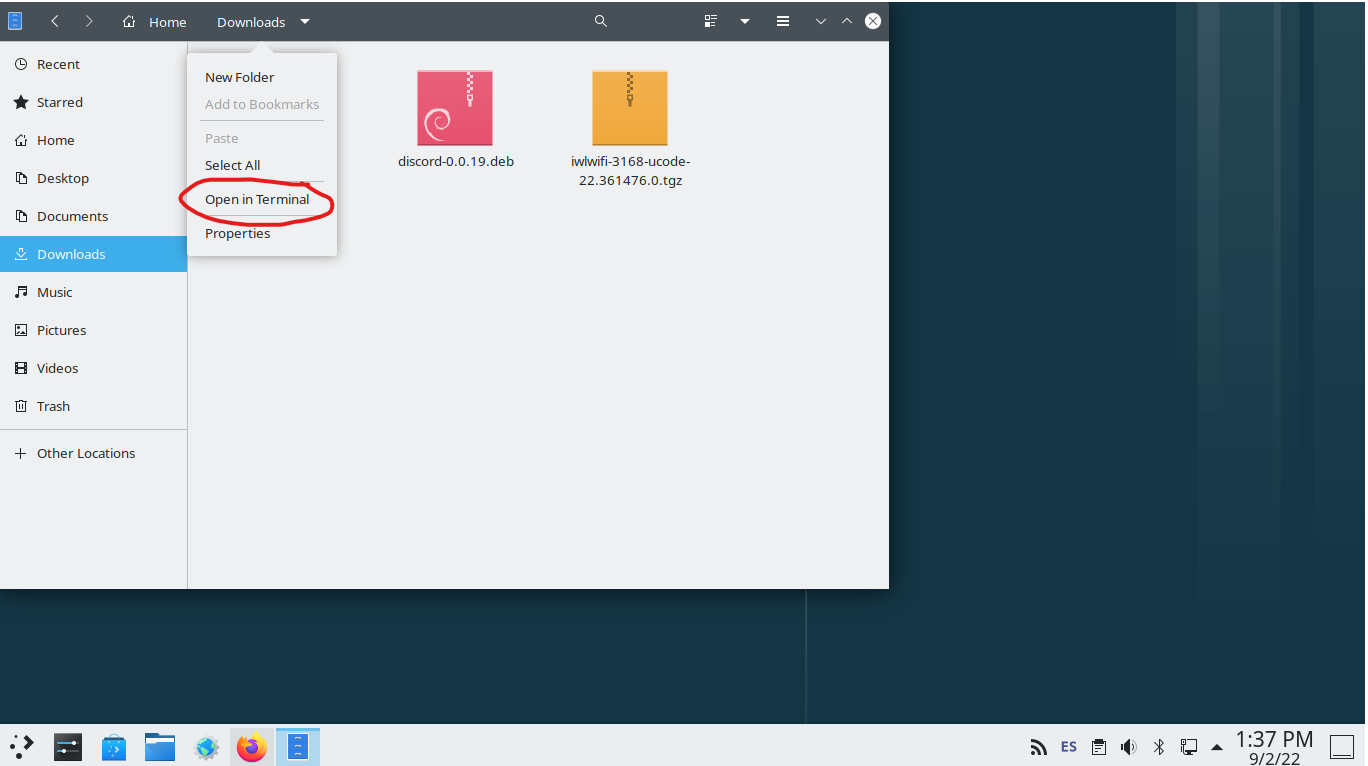 Ahora vamos a la carpeta Downloads, click derecho, Abrir en Terminal.