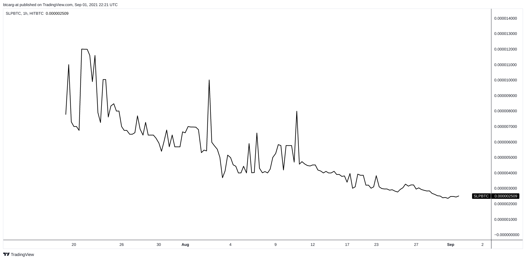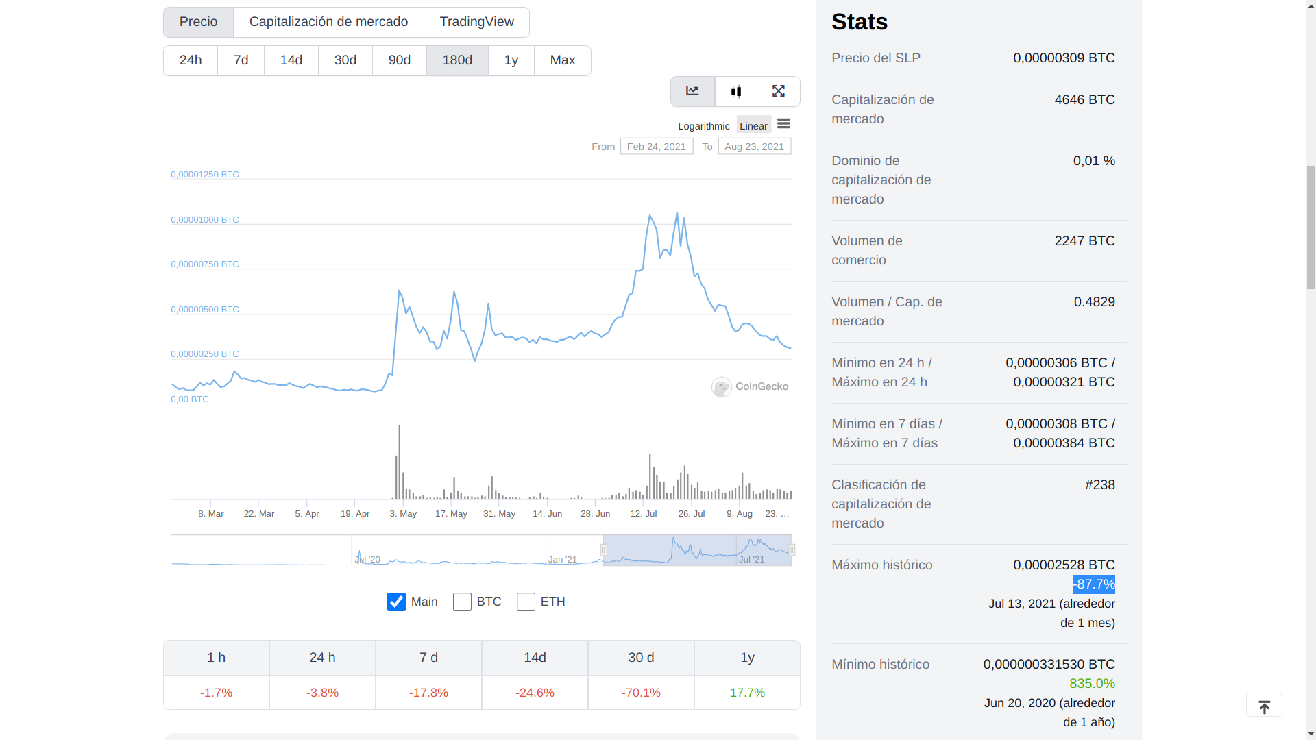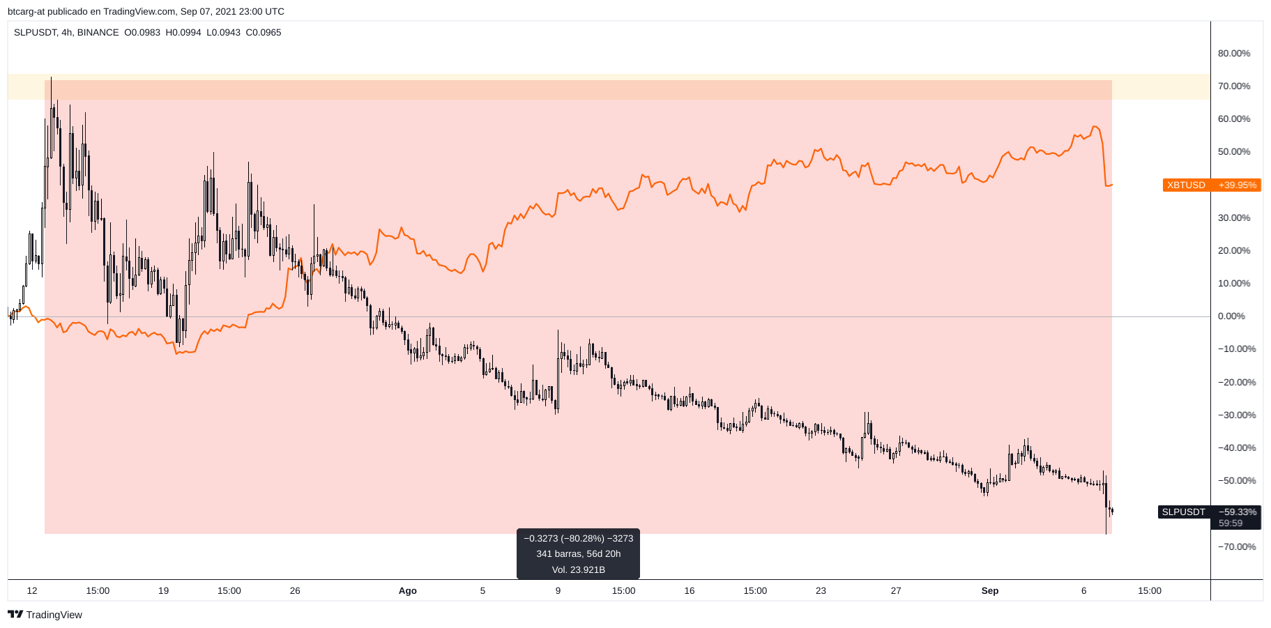 Cálculo: 4646 (cap de SLP en BTC) / 18795131 (cap de BTC en BTC) * 100)