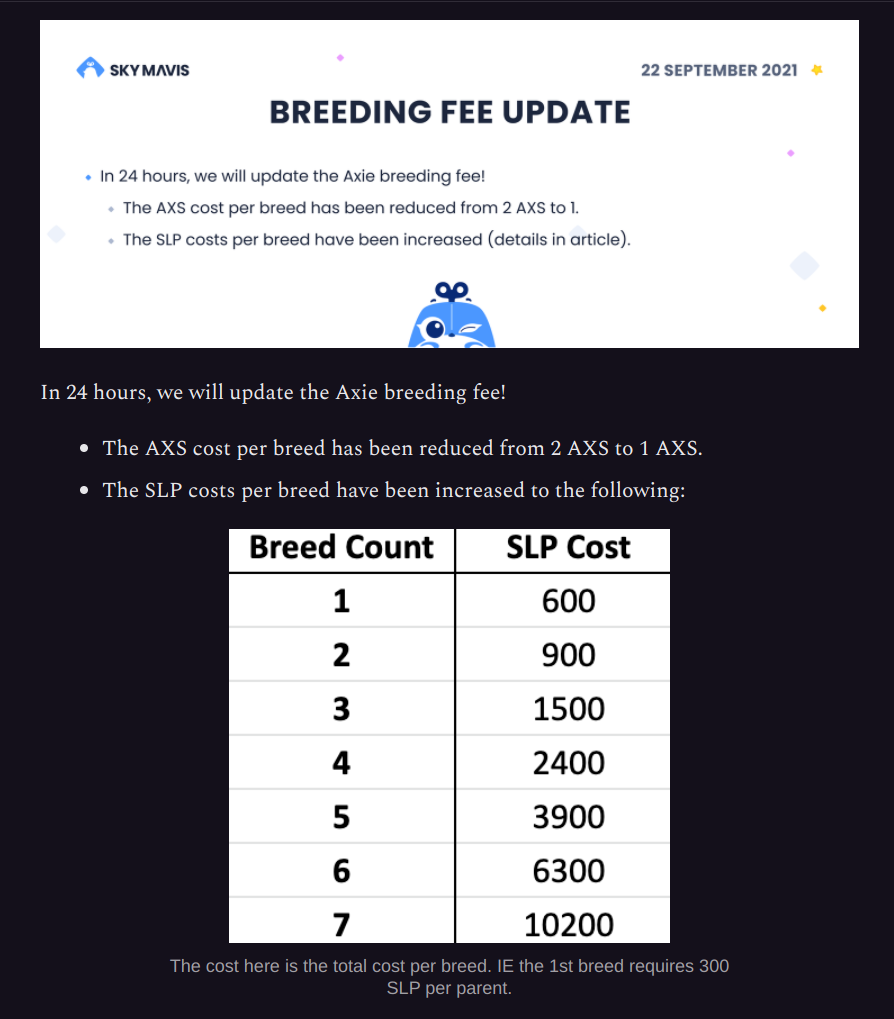 Recientemente el costo de criar excedió al costo de comprar uno nuevo. Los desarrolladores bajaron el costo de crianza de 4 AXS a 2 AXS.