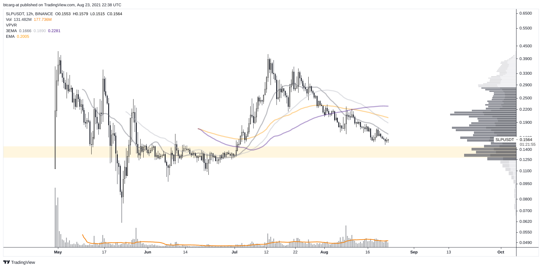 - Nivel de precios con mayor interés en torno a los 0.12 USD desde Volume Profile (a la derecha)