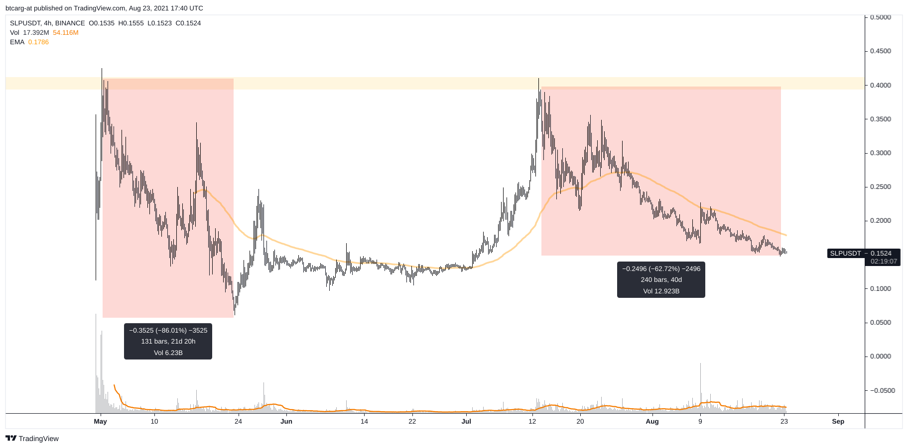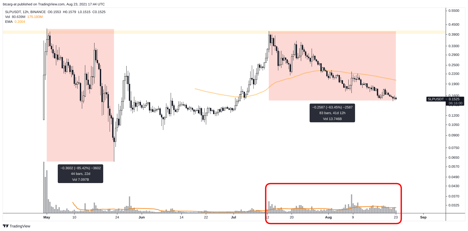 Si pierde el nivel de los 0.12 USD es probable que colapse, aunque supongo que harán lo que describí antes traduciendo el posteo de Coinopsy: intentarán estirar el sistema lo máximo que puedan.