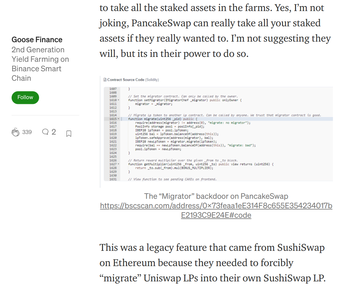 A los riesgos inherente a estos proyectos (Binance, BNB, exploits de cada protocolo) se suma el riesgo de rugpull, algo que lamentablemente es muy probable que se ponga de moda en algunos meses.