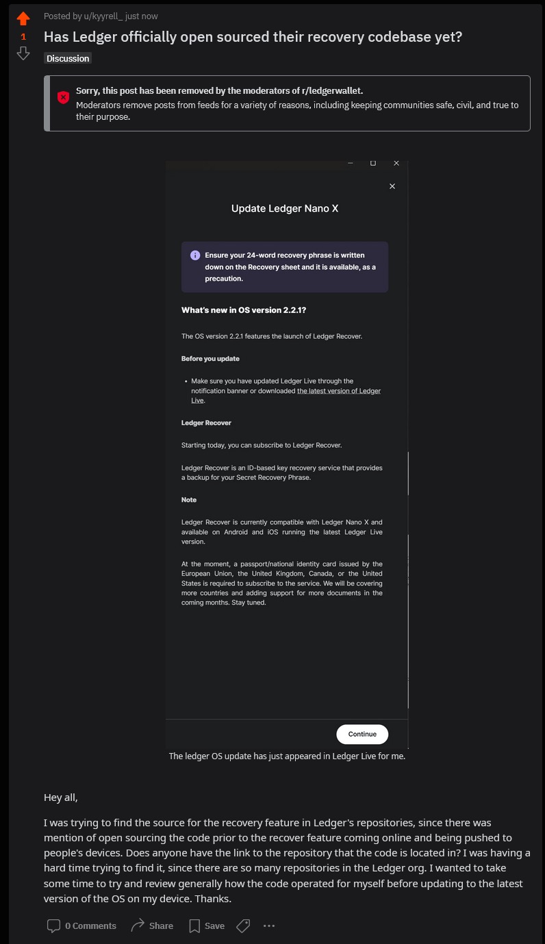 El usuario pregunta cómo se pueden atacar los monederos de Ledger. El hecho de que su monedero cuente ahora con código de extracción de claves parece importante, sobre todo porque pregunta específicamente por la seguridad y los hackeos, pero Ledger está haciendo shadow banning a cualquiera que intente darle esa información.