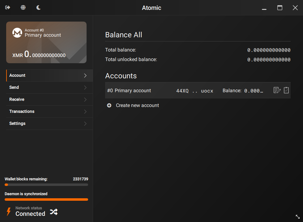 Esperar a que se sincronice. Este paso se hace solo una vez se abra por primera vez luego de terminar el paso anterior pero demora. A mi me tardo aproximadamente 7 horas en sincronizarse, una vez finalizado me apareció mi saldo de Monero que envié a Atomic. La sincronizacion se ve como en la imagen siguiente en la parte inferior izquierda de la misma.