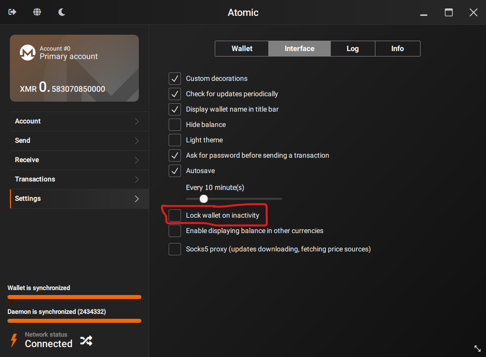 La sincronización es mejor que se haga de forma constante e ininterrumpida. Para esto se requiere de internet y de que la sesión no se cierre por inactividad. El tema del internet no depende 100% de nosotros pero el segundo punto si. La GUI wallet de Monero tiene activada por defecto una configuración que cierra la sesión por inactividad de 10 minutos. Recomiendo desactivarla para que no corte la sincronización, luego si se quiere volver a activarla ya depende de cada uno. Para ello vamos a la parte de “settings” —> “interface” y la desactivamos.