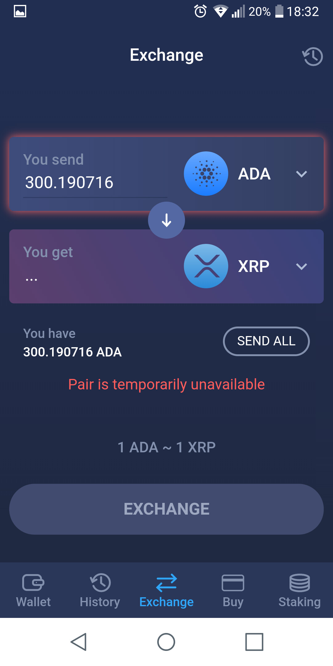 Hola, queriendo sumarme a la ola de XRP quise cambiar los saldos que tengo en ADA y XTZ y no me deja. Probe con otras monedas y tampoco me deja.