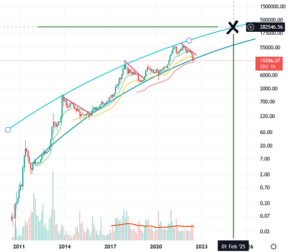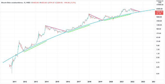 Buenas, les comparto este gráfico logarítmico con soporte arqueado de 10 años, líneas tendenciales bajistas del bear market (fucsia) y líneas de prolonganción de bull market (verdes):