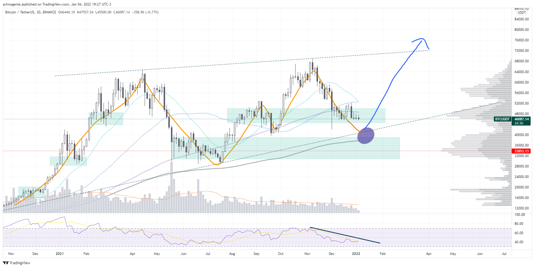 El panorama económico mundial viene para atrás y los activos de más riesgo suelen ser los primeros en venderse, pero se me ocurrió copiar el patrón de caída de principios del 2019 (cruz fucsia), donde hubo un velón rojo mensual, 4 chiquitos de lateralización/acumulación y después de vuelta para arriba.