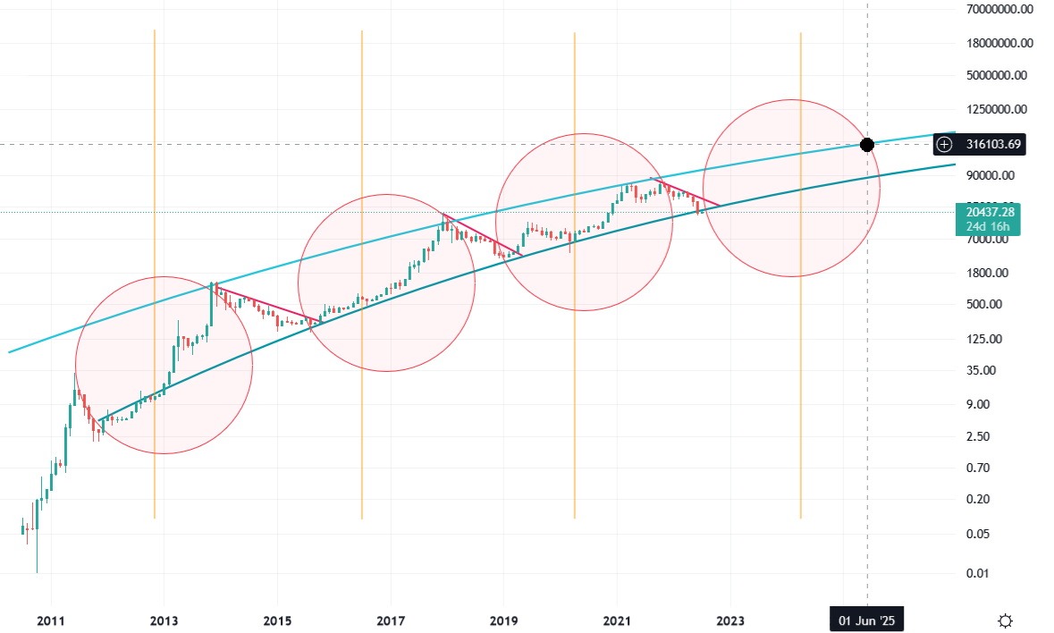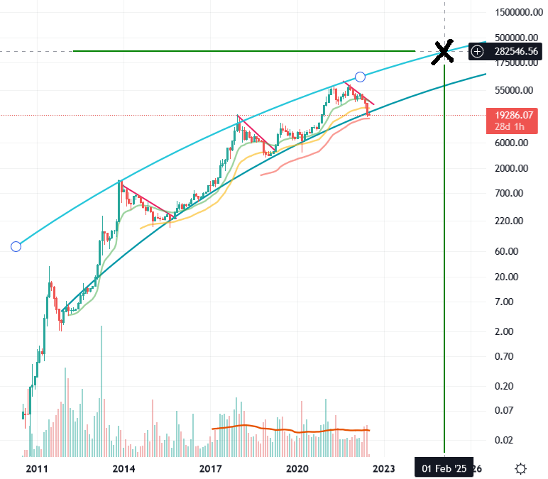 Al extrapolarlo a la actualidad, vemos como luego de pegar un subidón, el precio se mantendría en acumulación en la zona del ATH, algo similar a lo que sucedió a fines del 2020, lo que coincidiría con el halving del 2024, y un nuevo ATH en los 300k, con posterior piso en los 100k.