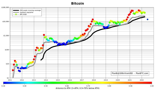 Some people think that it is time for blue dots and that bitcoin will drop to $15K. This is what a blue dot at $15K would look like ... below 200wma and below realized price. Not gonna happen IMO. >— PlanB (@100trillionUSD) April 24, 2022