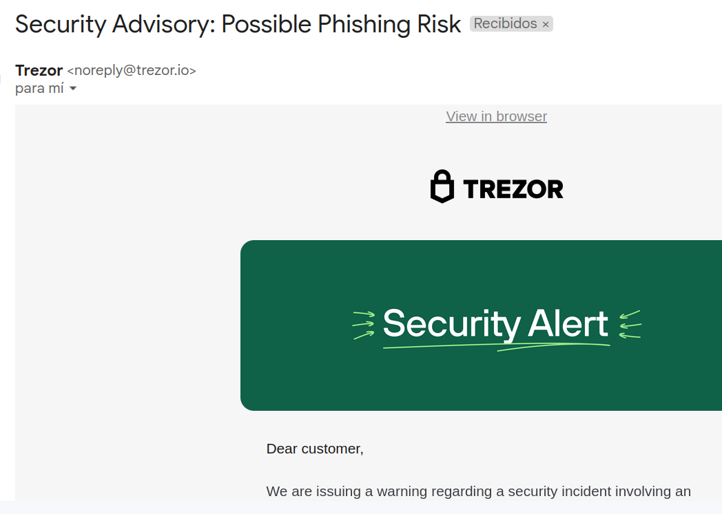 Estamos emitiendo una advertencia relativa a un incidente de seguridad relacionado con un correo electrónico no autorizado que se ha enviado suplantando la identidad de Trezor.