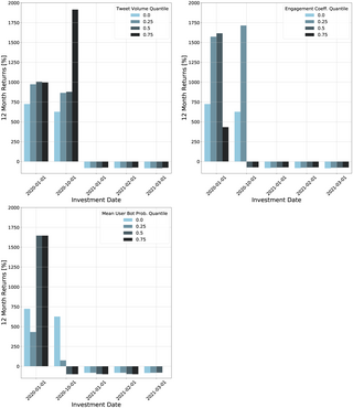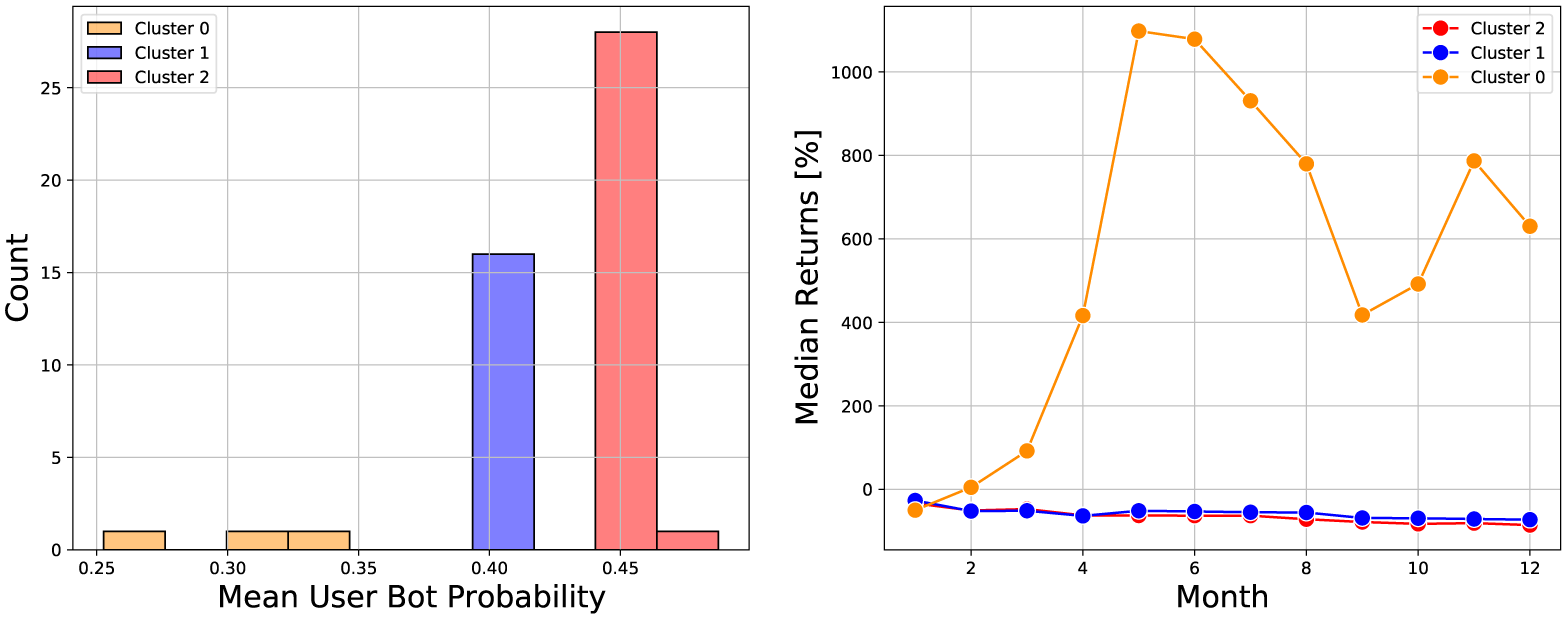 Este algoritmo calcula la probabilidad de que una cuenta de Twitter sea un bot. Las probabilidades medias más altas de bot se asociaron con criptomonedas de menor rendimiento, porque desarrollar una comunidad genuina y real, lleva infinitas veces mayor esfuerzo.