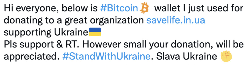 Grupos voluntarios en Ucrania recibieron este 25/02 una donación de 80 BTC.