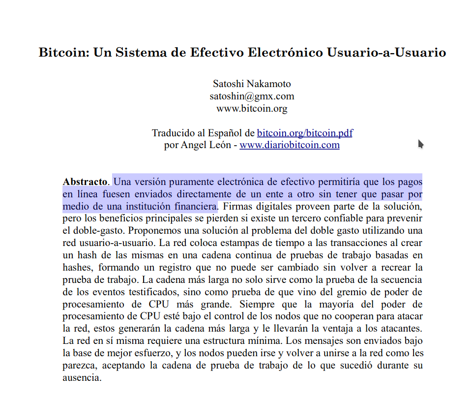 Manifiesto escrito por la entidad anónima Satoshi Nakamoto en 2008, describiendo el protocolo Bitcoin y toda su hoja de ruta desde cero.